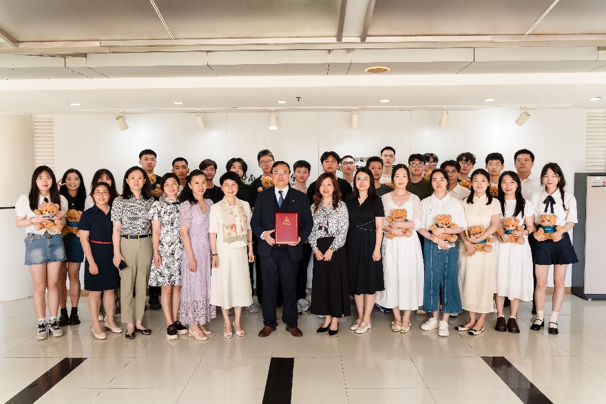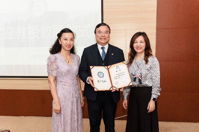 仪式上,刘毓洁和文吉分别为张健中颁发证书和佩戴校徽。