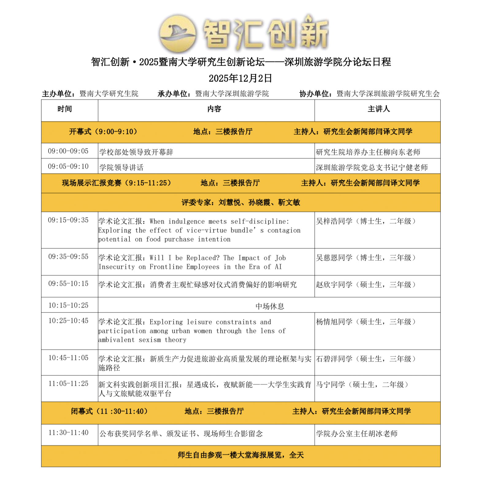 为进一步促进研究生学术研究与创新实践的交流互动,集中展示研究生学术风采与高水平创新成果,暨南大学深圳旅游学院将于2025年12月2日举办“智汇创新·2025年暨南大学研究生创新论坛——深圳旅游学院分论坛”。