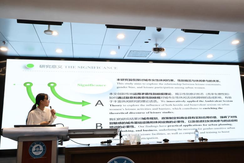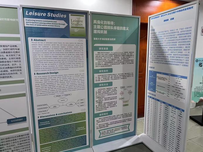 吴梓浩对“放纵与自律组合型产品”如何影响消费意愿进行了生动阐释,通过情景实验揭示消费者心理的微妙变化,引发在场师生对食品营销策略的深入思考。吴慈恩关注AI技术背景下一线员工的“就业替代焦虑”,通过实证数据刻画了这一现实议题的心理形成机制,提问环节中多位同学就AI与人力资源管理的未来走向展开交流。马宁构建的“星遇成长”双驱平台,将大学生实践与夜间文旅资源创新结合,其完整的商业模式与社会价值构想令人耳目一新。赵欣宇探讨的“主观忙碌感”与“仪式消费”的关系,为理解现代消费者的情感补偿机制提供了新视角。石碧洋则系统阐释了“新质生产力”赋能旅游业高质量发展的路径,体现出扎实的理论建构能力。杨情旭从性别态度视角切入城市女性休闲研究,引发了关于社会观念与休闲平等的热烈讨论。