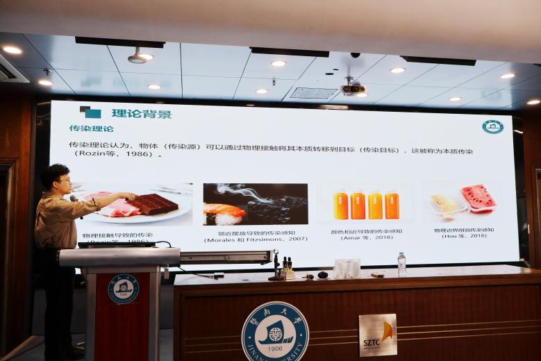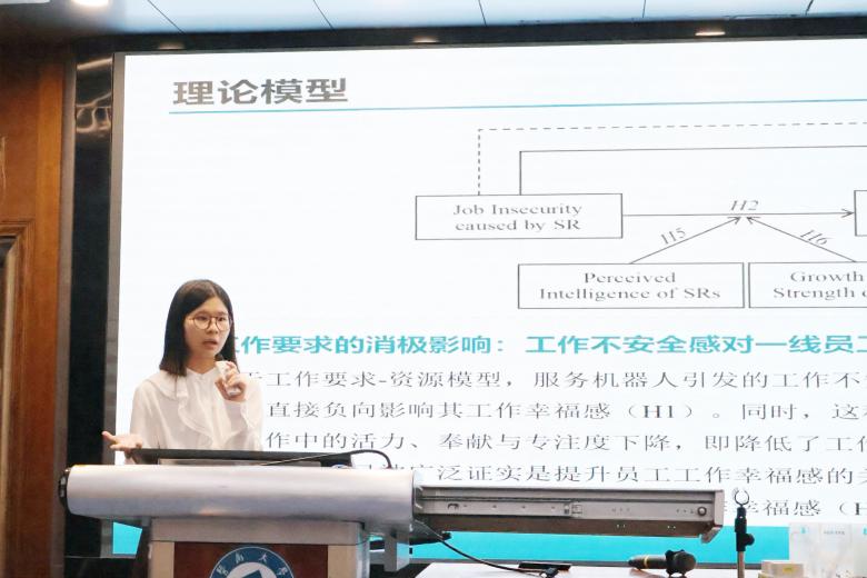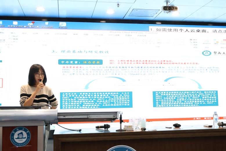 在学术口头报告环节,6位研究生先后汇报了研究成果,选题涵盖消费行为、人工智能、文旅融合等多个前沿方向,展现出宽广的学术视野。