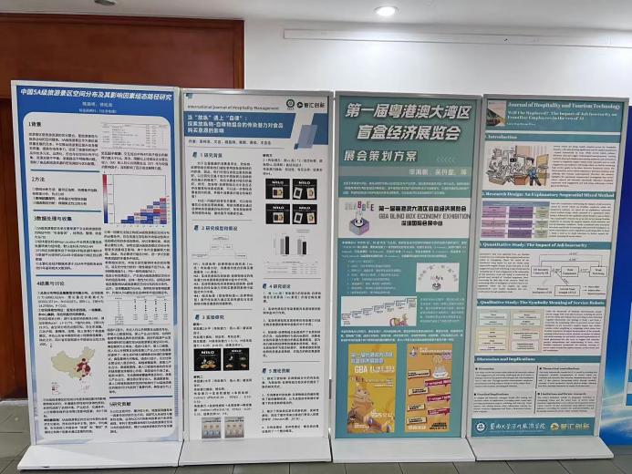 学术海报展示环节在综合楼大厅同步进行,10位同学通过精心制作的海报可视化研究成果,吸引了大批师生驻足观看,并就研究设计、数据收集与行业启示等与作者进行一对一深入交流,拓展了学术对话的深度。